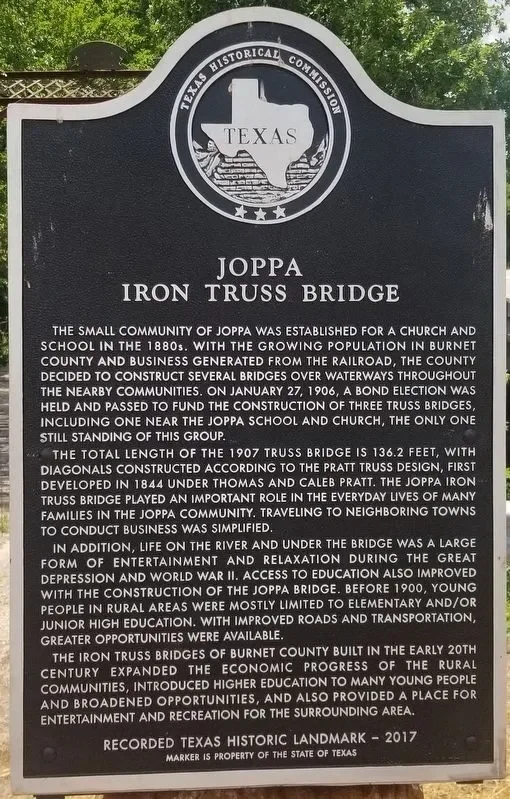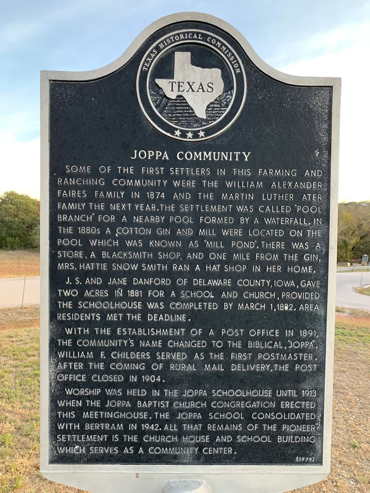 By 1891 a post office was established and the community’s name changed to the biblical name “Joppa”. The post office was closed in 1904 with the coming of rural mail delivery. On May 19, 1904, a telephone line was installed in Joppa. An iron bridge was built across the San Gabriel River in 1907. The area received electricity in 1939 from PEC. The Joppa school consolidated with Bertram in 1942. The church and school building which serves as a community center are all that remain.